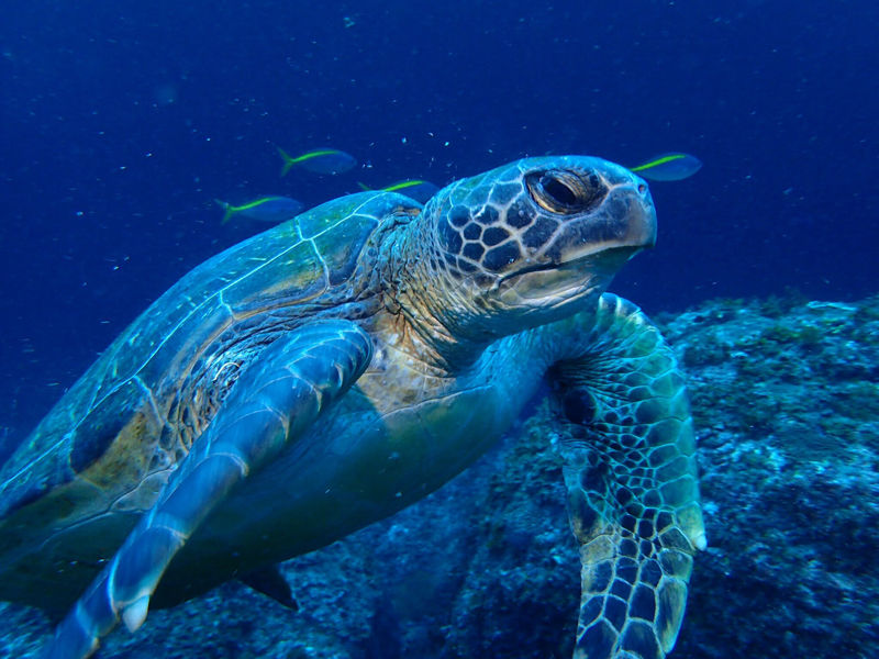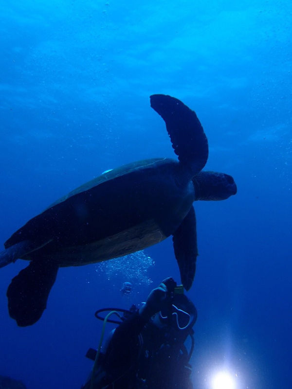 このカメさんはアオウミガメと言って、小笠原を最大の繁殖地とする、ダイビングでは定番のカメさんです