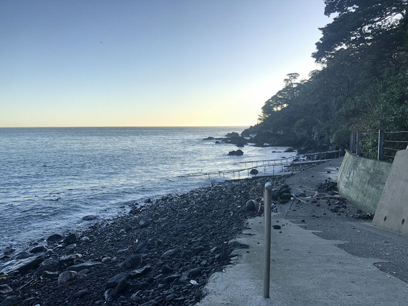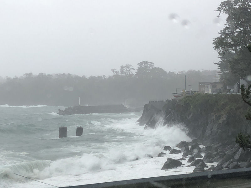 12日朝8時の時点で、温泉丸に波がかかっている状況