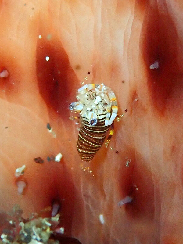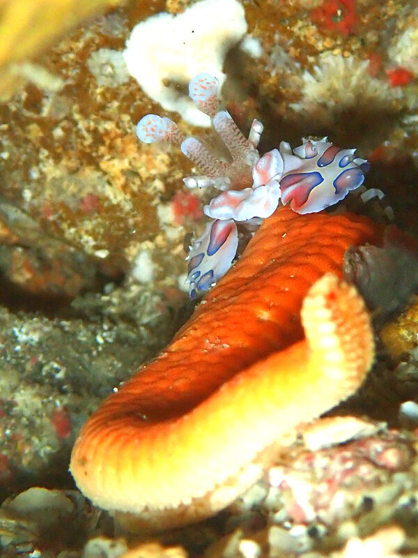 アカオニナマコにくっついたヨコシマエビ~~っ