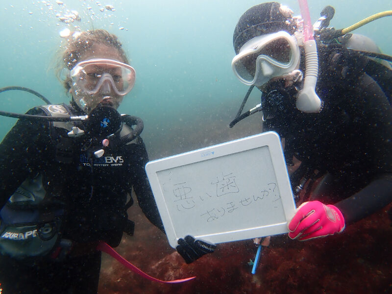 とりあえず笑かそうと思って、潜降直後のスレートに『悪い歯ありませんか?』って書いたら、笑って溺れそうになる体験ダイバー