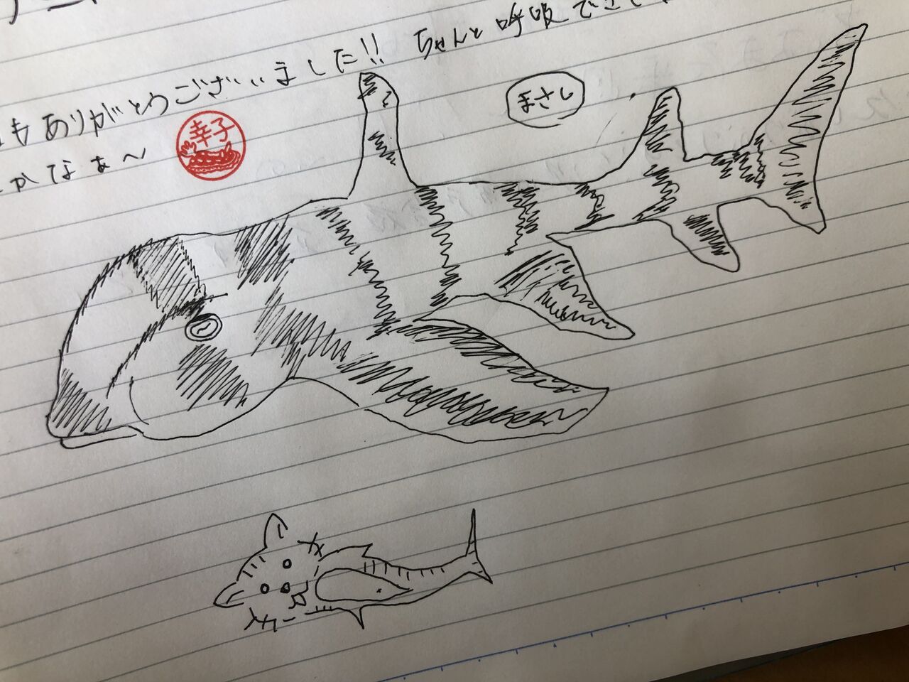 さっちゃんが描いたネコザメの頭に、マサシさんが胴体を接続して完成っ