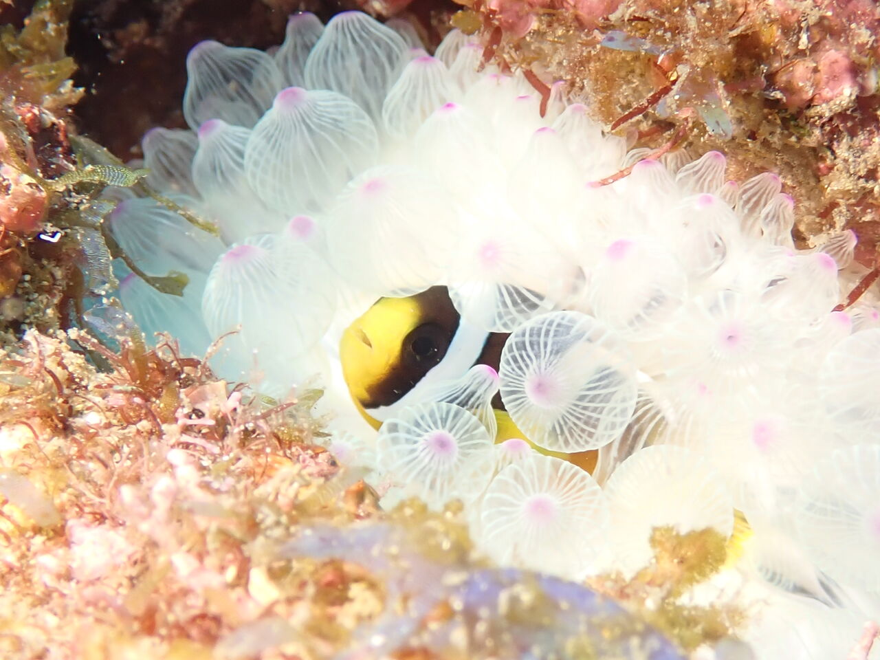 このサンゴイソギンチャクの色はきれいなんだけど、実はれっきとした白化現象なんですって