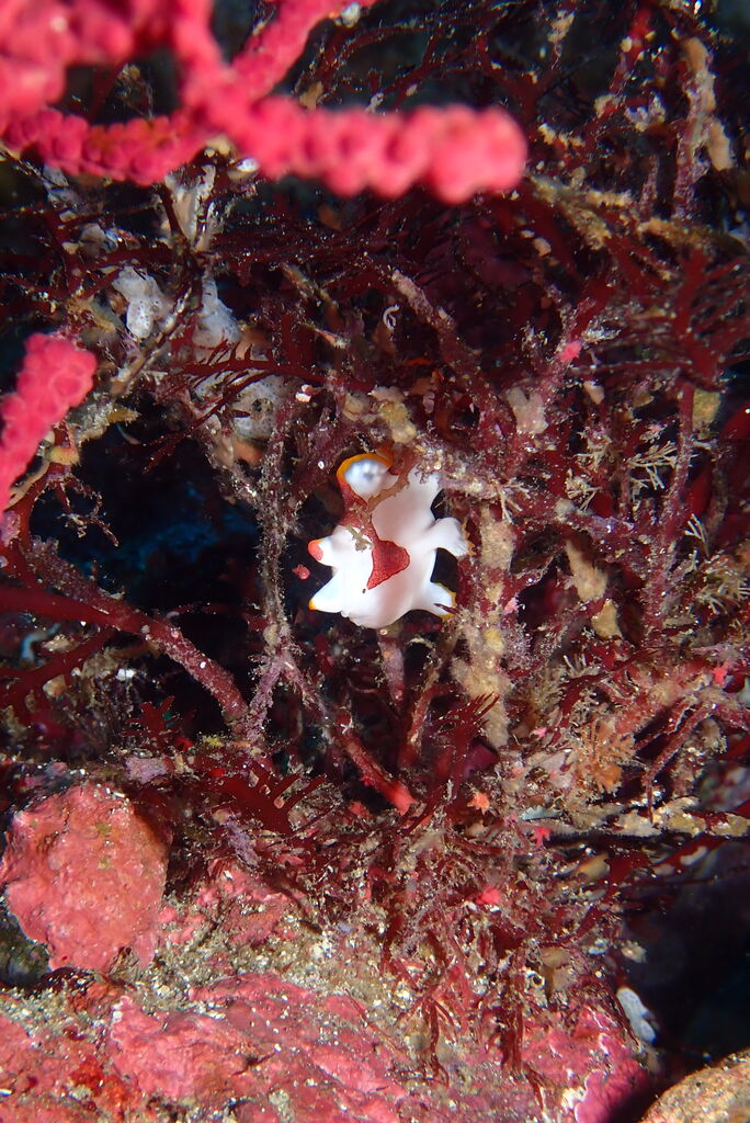 ニュウトウタテジマウミウシが登っている