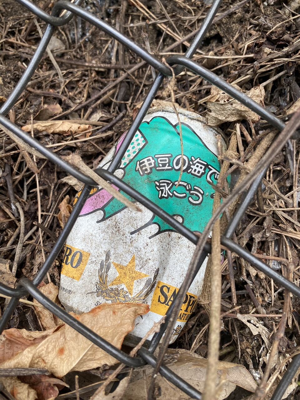 土砂崩れ防止金網の中に年代物の缶発見